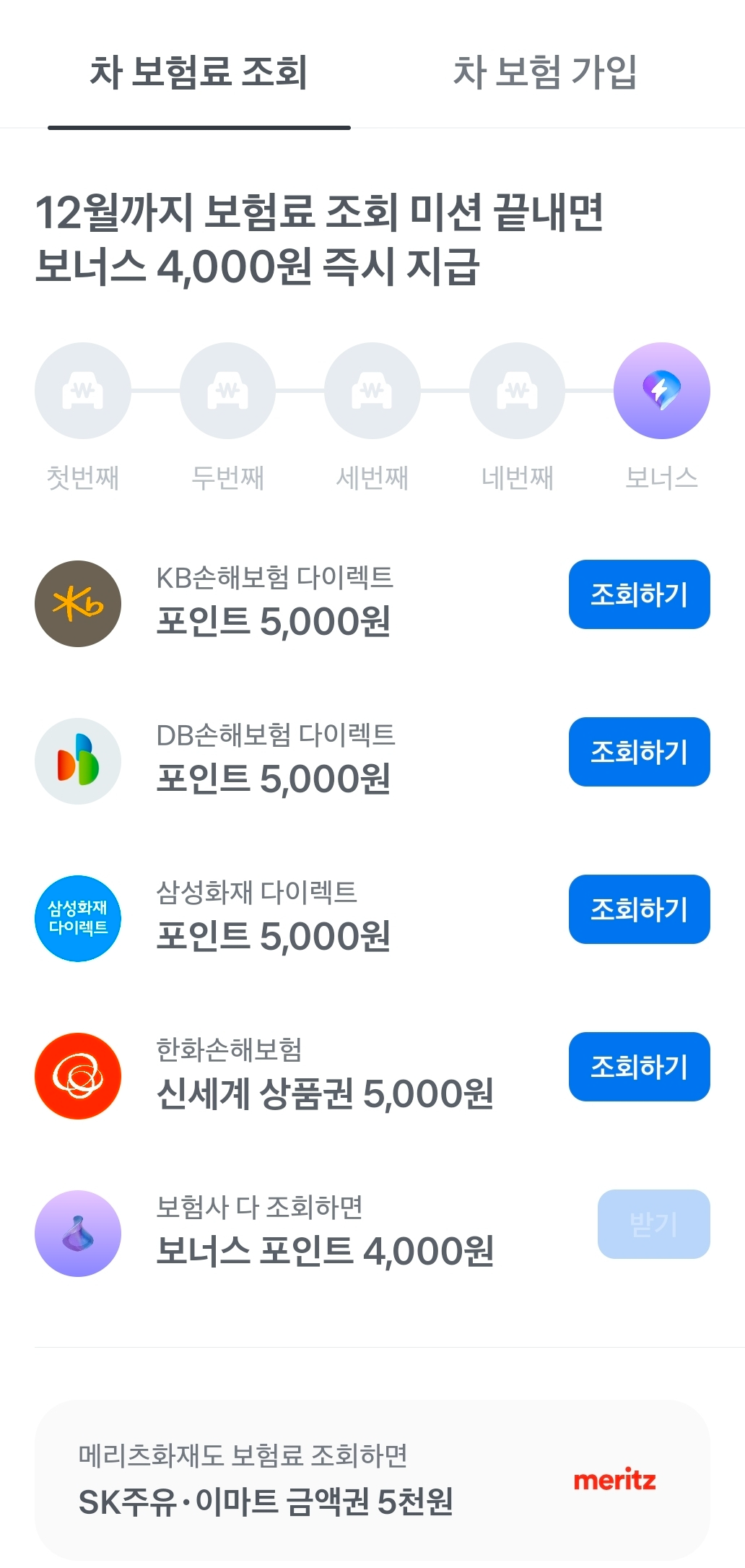 | 메리츠 화재 | 조회 - 가입 30,000 | 조회 - 가입 30,000 (하나카드결제시) | 조회 - 가입 30,000 | 조회 - 가입 5천원 금액권 SK주유소/이마트 |