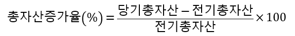 •총자산 증가율: 회사에 투하되어 운용되고 있는 총자산이 올해 얼마나 증가하였는지를 표시하는 비율로서 회사 전체적인 성장 규모를 측정하는 지표가 된다.