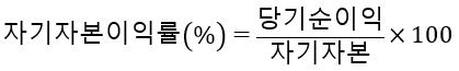 •자기자본 이익률: 회사의 주인인 주주의 입장에 서 투자자금 단위당 얼마의 이익을 벌어들였는지를 파악할 수 있는 지표이다.