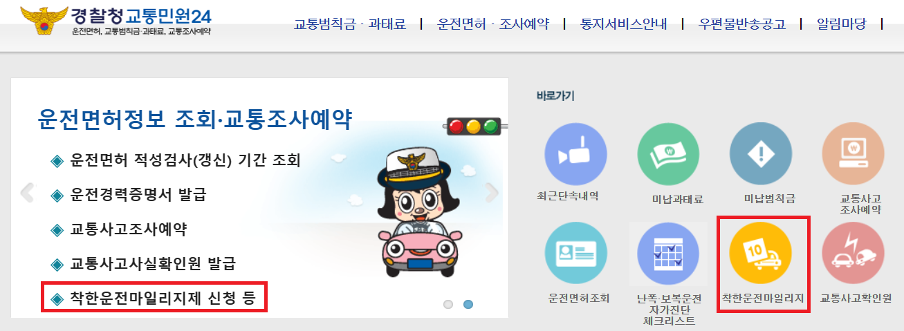 경찰청 교통민원24 (이파인) 홈페이지의 [착한운전마일리지] 에서 가능합니다.